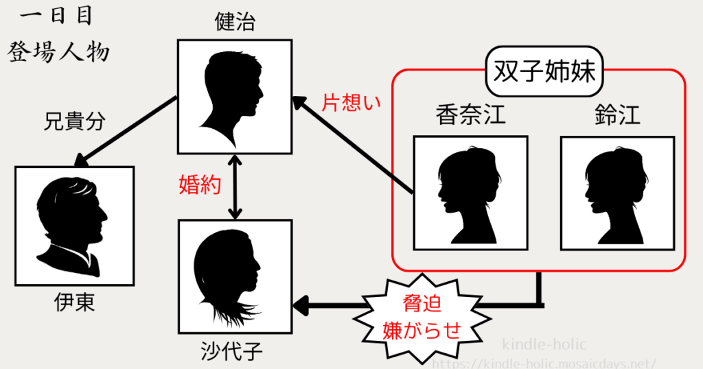 それは十年前、伊東の後輩・健治とその婚約者・沙代子が、ある双子姉妹によって人生を狂わされていくことから始まりました……。